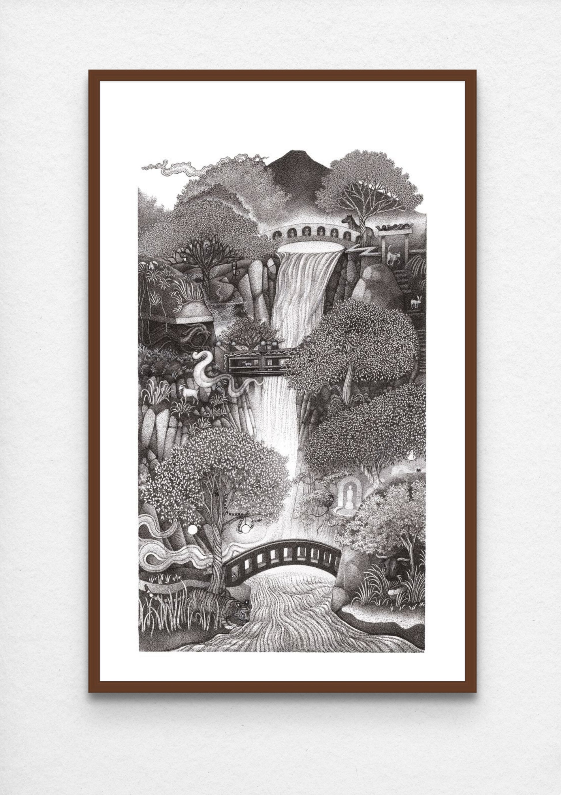 A 1 of 1 physical hand made stippling drawing completed using ink dots to build a complete vast landscape of a calming waterfall wrapped between old trees and ancient architecture, with hidden messages and meanings relating to the ideas of the Chinese zodiac, character types such as rabbits, dogs, tigers, dragons and cultural art styles associated with Chinese influences.