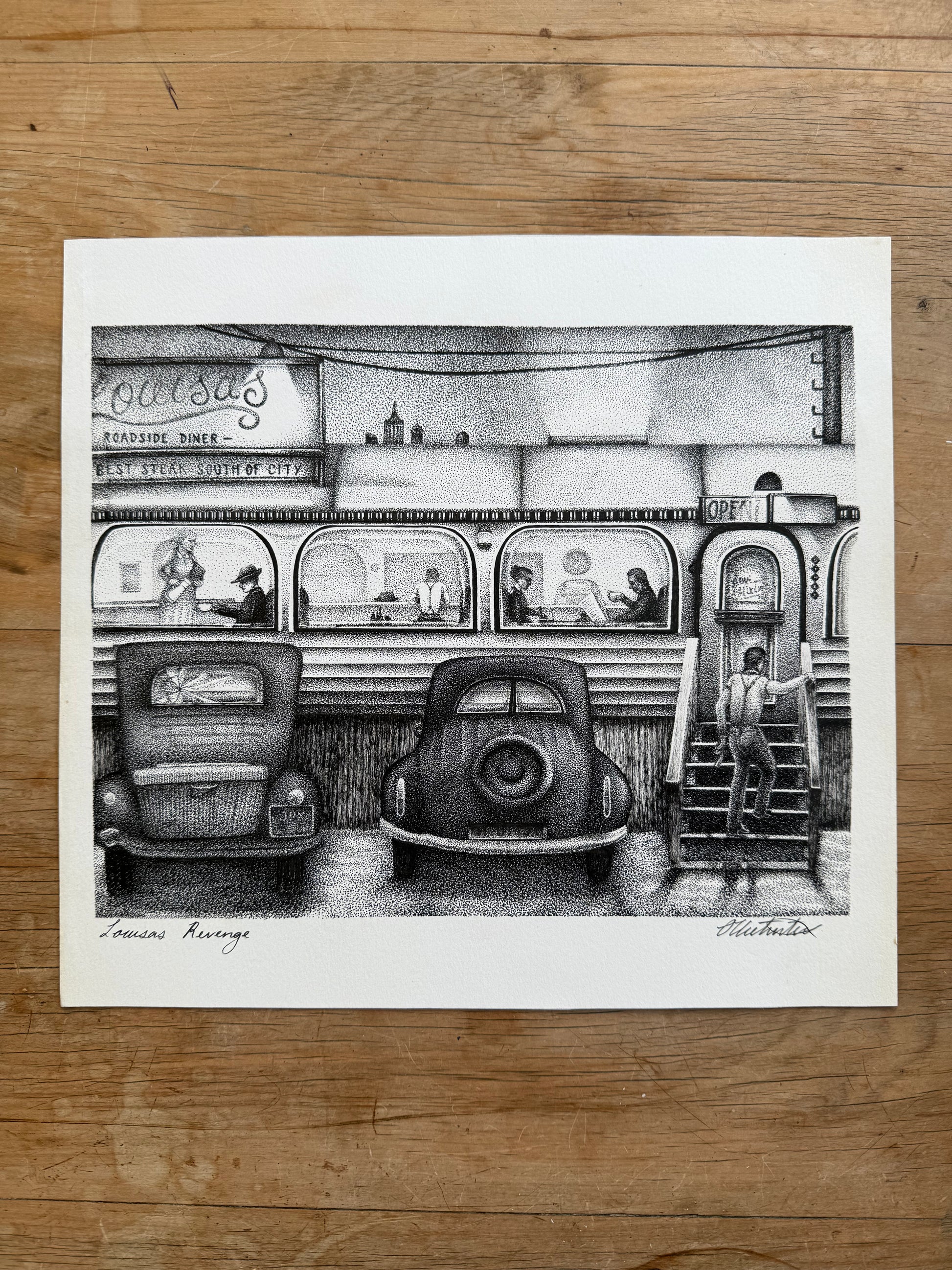 A 1 of 1 physical hand made stippling drawing completed using ink and precisely placed dots to create this retro city scape at night.