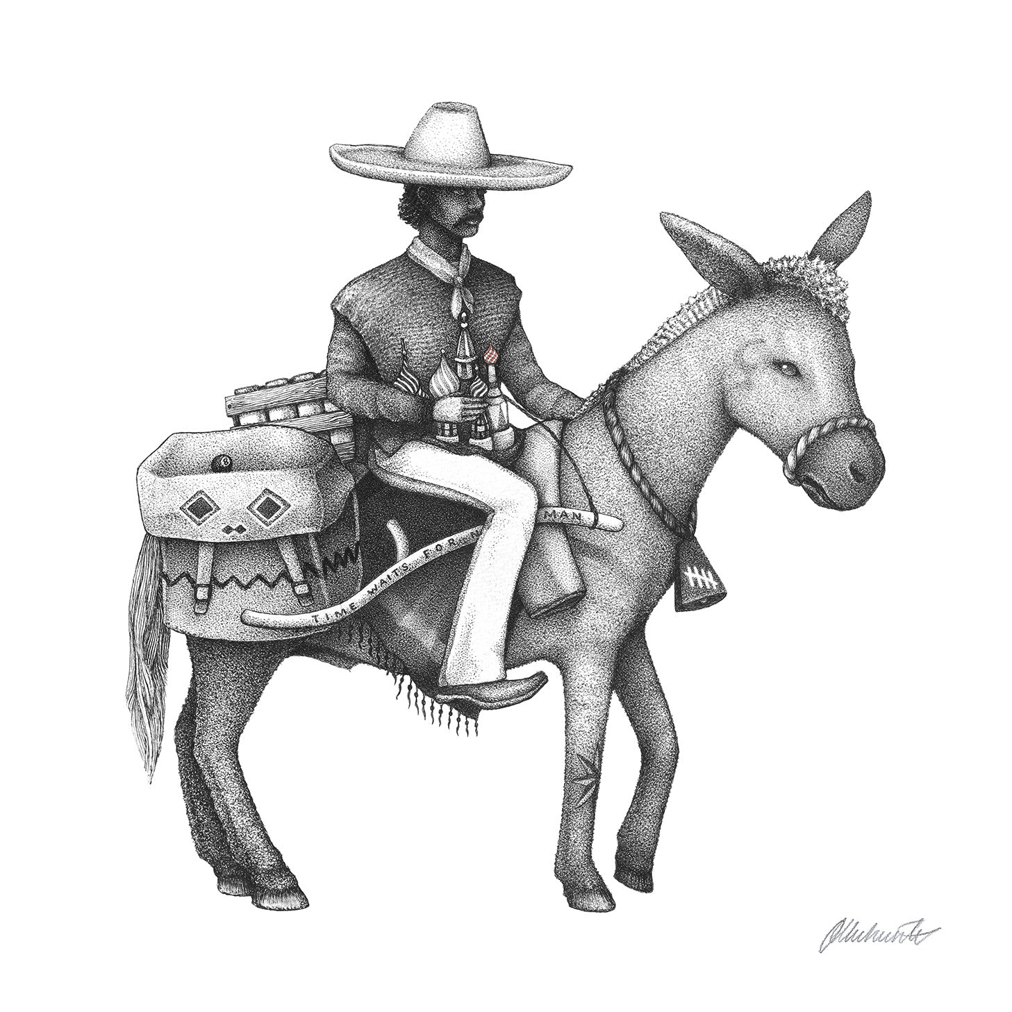 A 1 of 1 physical hand made stippling drawing completed using ink dots to build a complete figure of a mysterious man on a mule, with hidden messages and meanings relating to the idea of time and death.