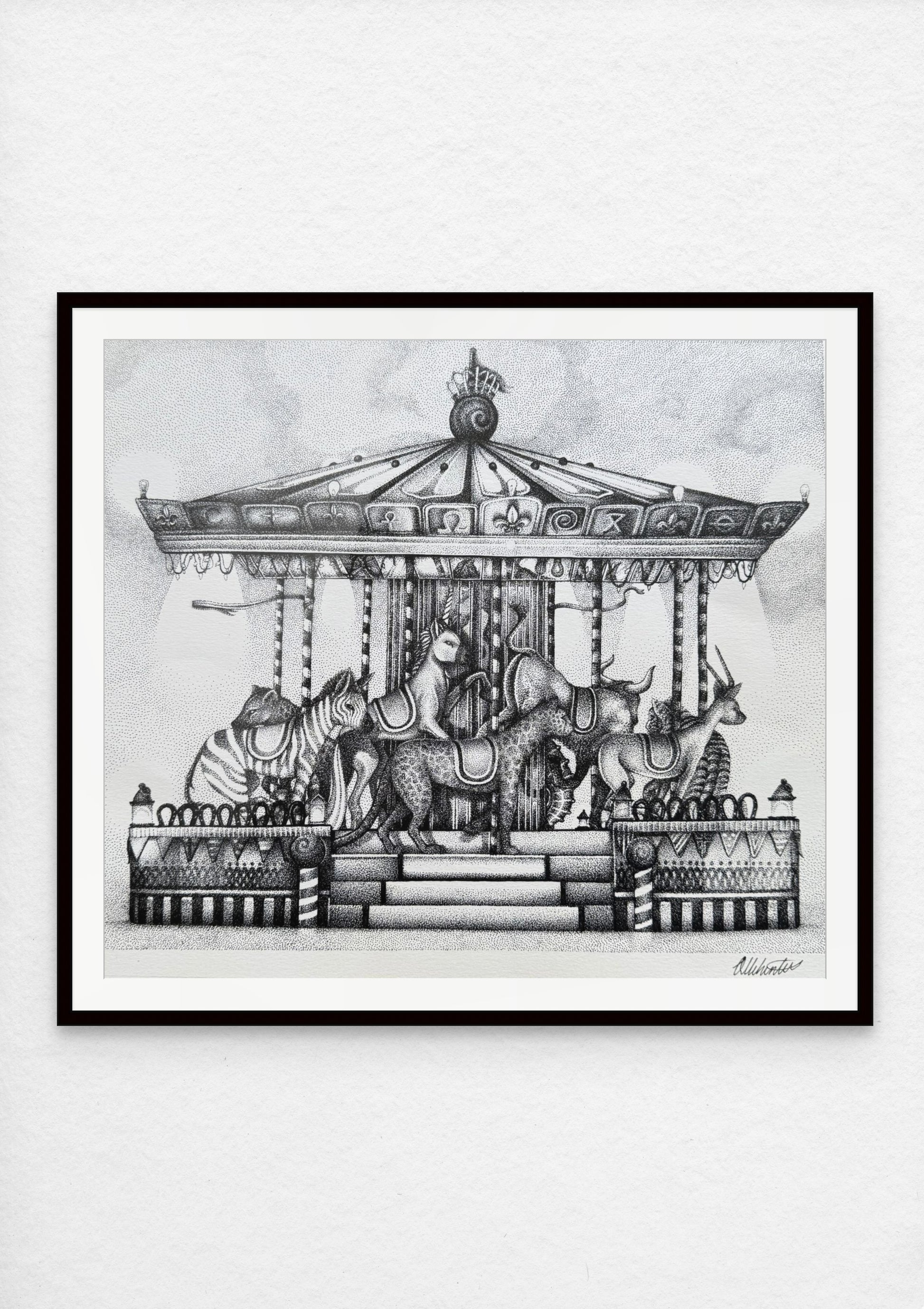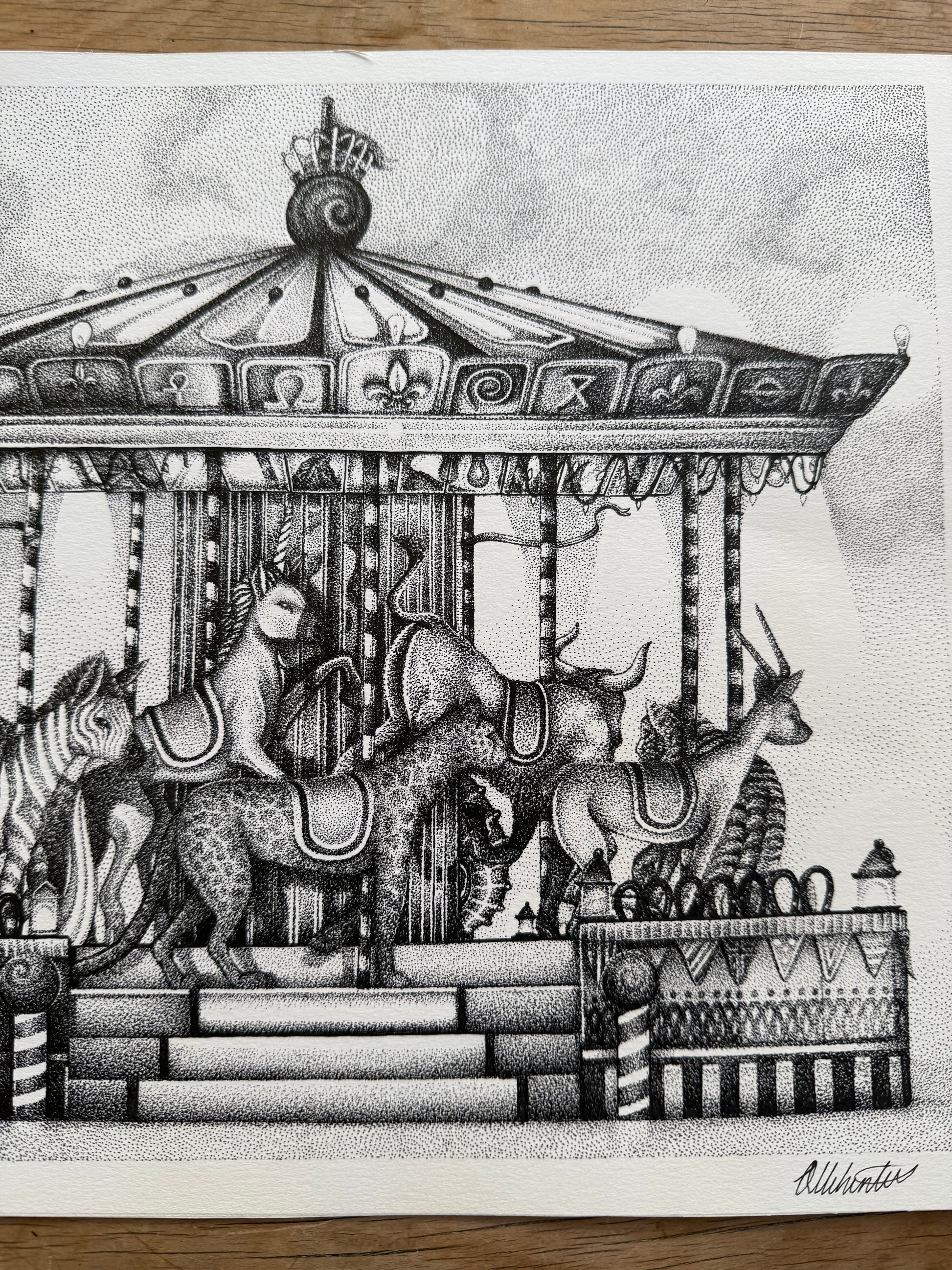 1 of 1 physical hand made stippling drawing completed using ink dots to build a scene of animals among a carousel of ink.